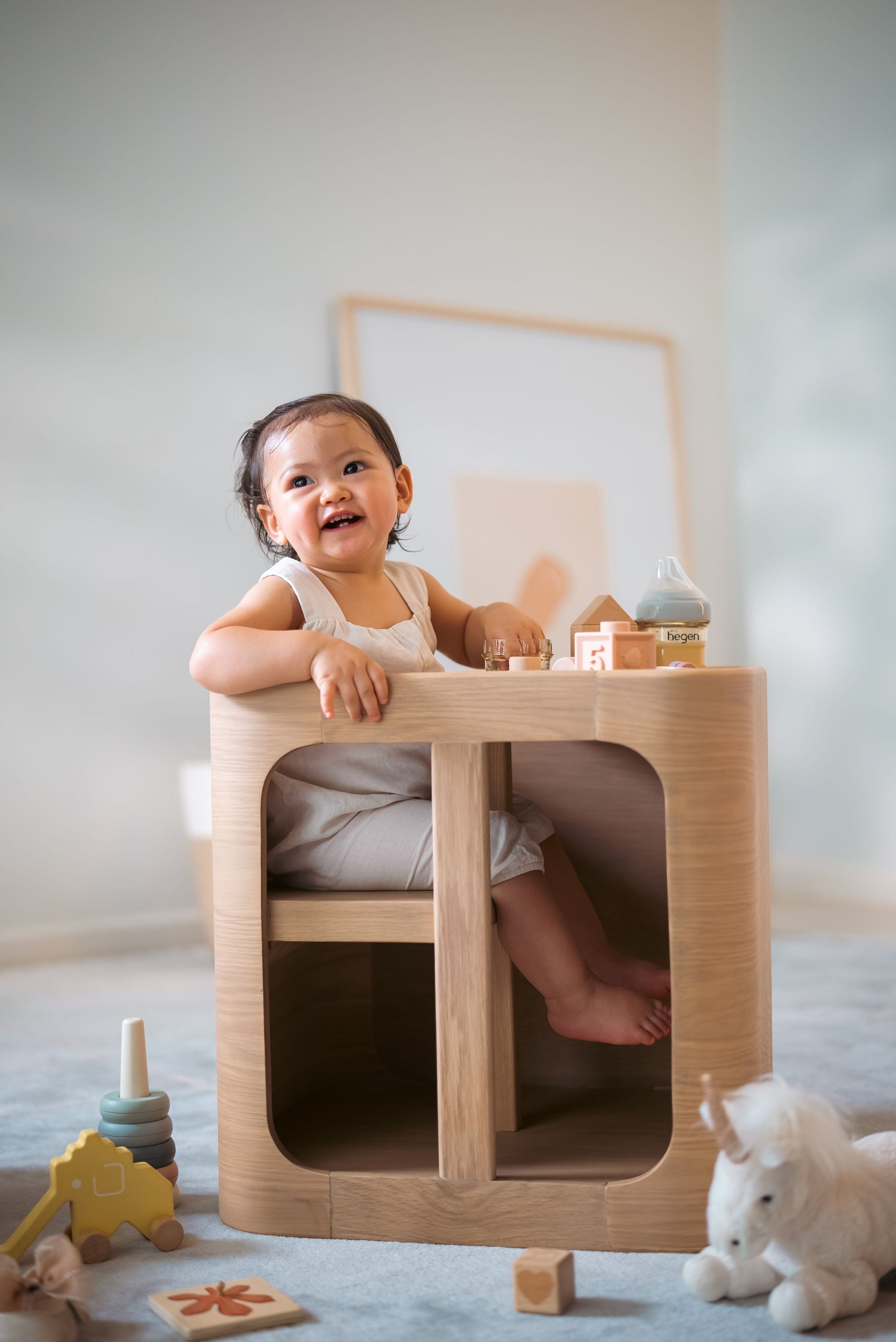 Multifunctional, the stool can be flipped from a comfortable seat/chair in the household onto its side as a secure space for the toddler to sit in, keeping the little one safe while mums attend to other tasks. Its square-round shape inspired by the Hegen Sqround™ feeding bottles features soft curves that keeps the toddler safe from sharp edges. With another flip, the stool is transformed into a tabletop, the perfect surface for the little one’s independent mealtimes or playtime.